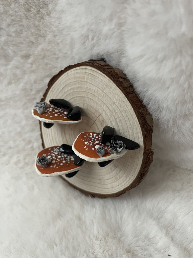 Martha est un rondin de bois non vernis (10x8 cm), trois champignons en argile réalisés et peints à la main.