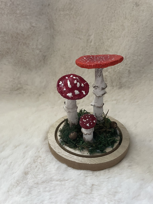 Nélia est une cloche en acrylique et socle en bois clair, glands et champignons vernis en argile peints à la main.