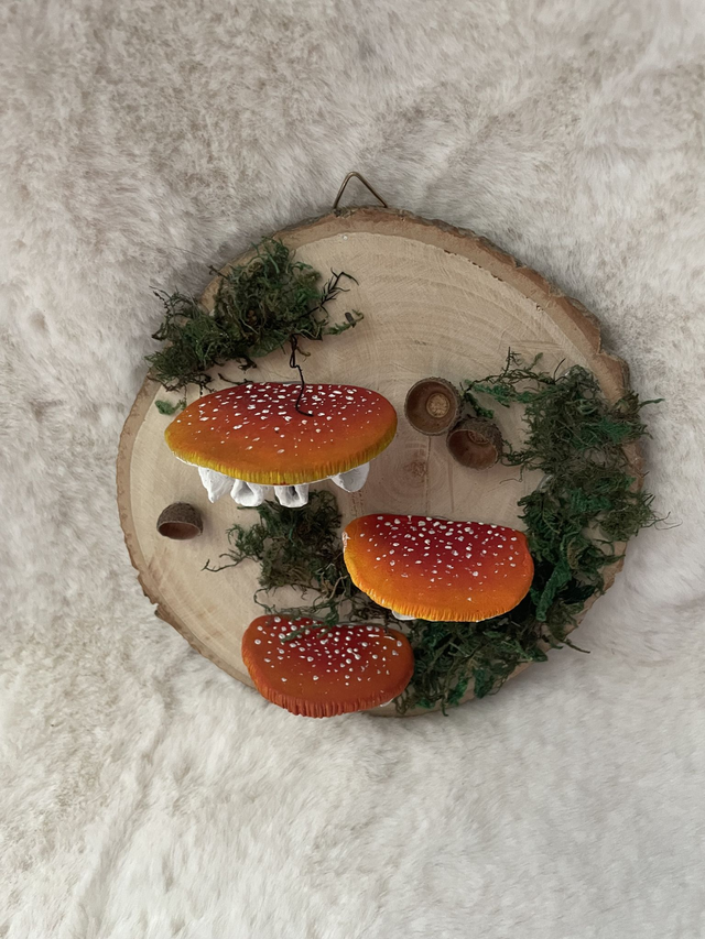 Odélia est un rondin de bois naturel (16x16 cm), trois champignons en argile réalisés et peints à la main.