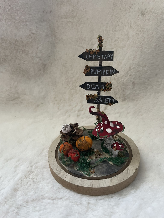 Prélina est une cloche en acrylique et socle en bois clair, pomme de pin, champignons et citrouilles en argile peints à la main.