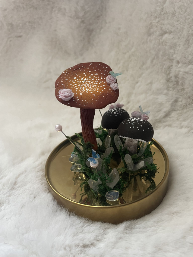 Rosalie est une cloche en verre et socle en laiton avec finition dorée, cristaux blanc et champignons en argile peints à la main où trônes des roses et papillons en acrylique.