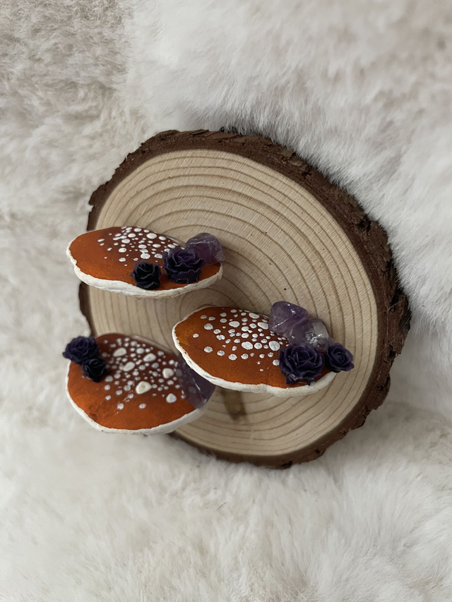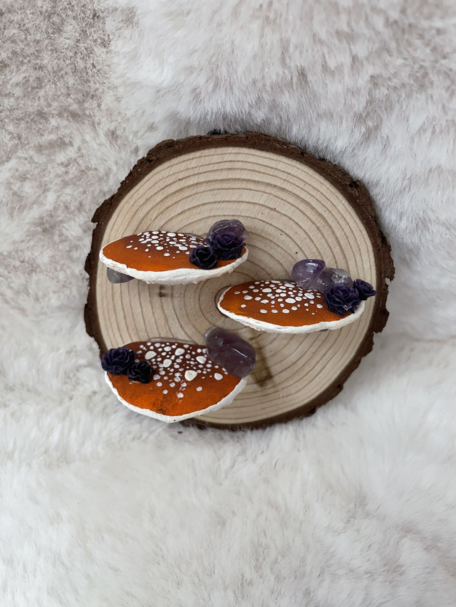 Beka est un rondin de bois non vernis (10x8 cm), trois champignons en argile réalisés et peints à la main.