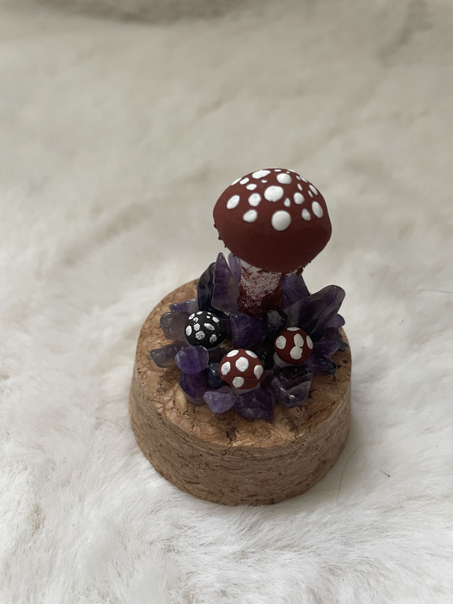 Emerie est une cloche en verre et socle en liège compacté, cristaux violet et champignons en argile rouge peints à la main.