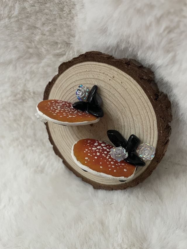 Hagata est un rondin de bois non vernis (10x8 cm), deux champignons en argile réalisés et peints à la main.